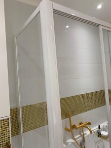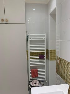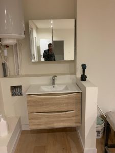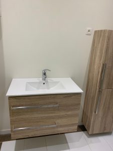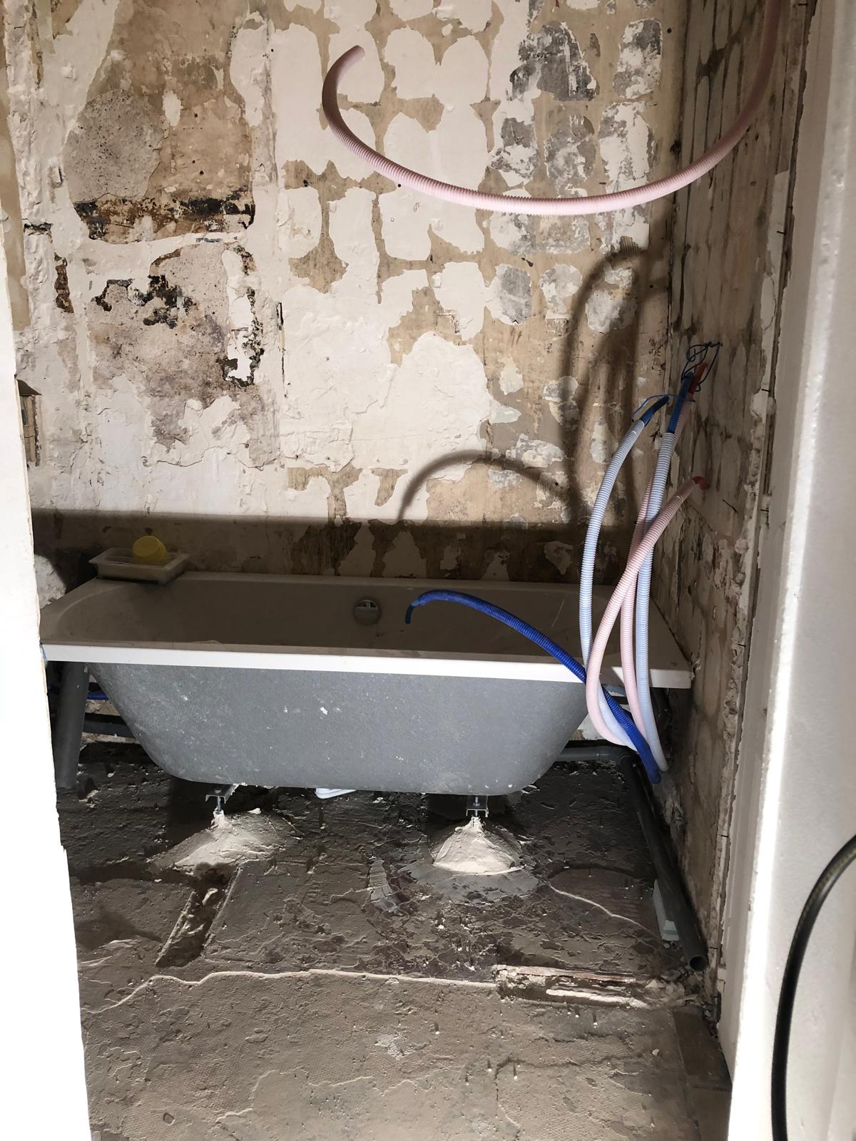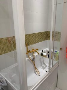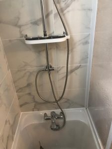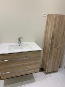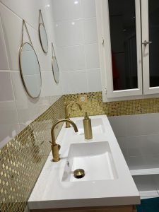 Avant notre intervention, la salle de bain présentait une fuite importante sous la baignoire et des installations anciennes. Les joints étaient abîmés, l’humidité permanente abîmait les murs et la plomberie n’était plus aux normes.